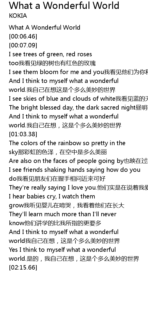 | [01:59.24] | Yes I think to myself what a wonderful world. shì de, wǒ zì jǐ zài xiǎng, zhè shì gè duō me měi miào de shì jiè |
