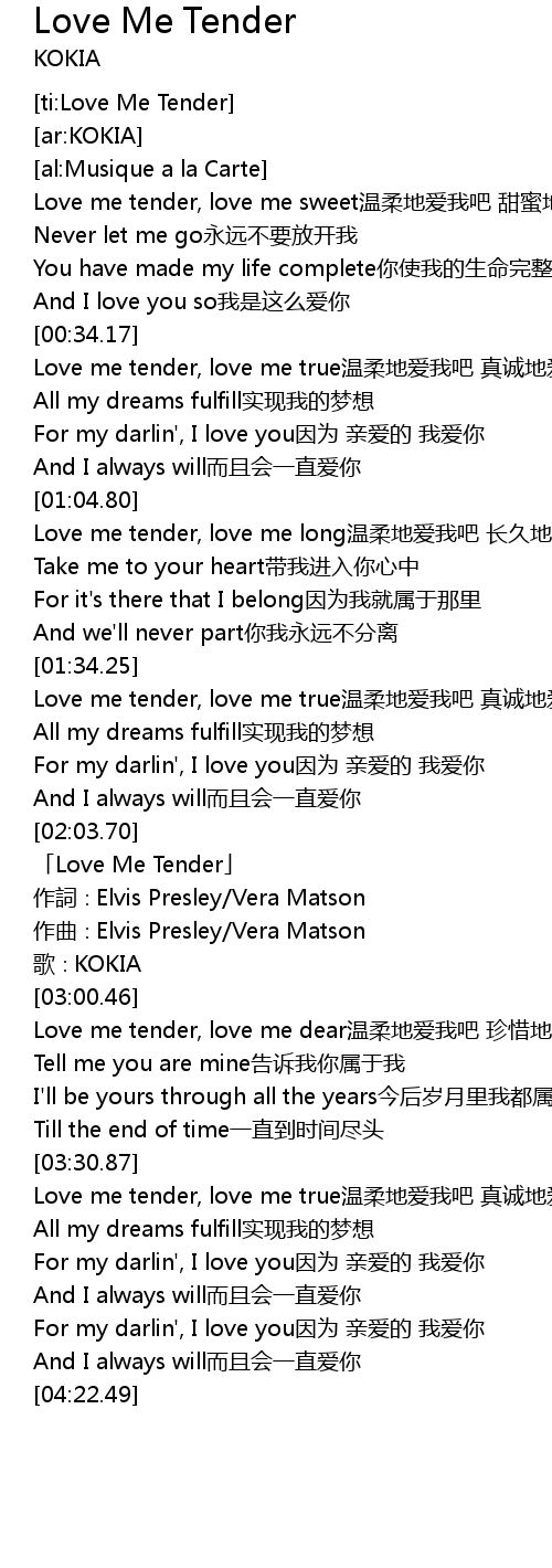 | [03:04.46] | Love me tender, love me dear温柔地爱我吧 珍惜地爱我吧 |