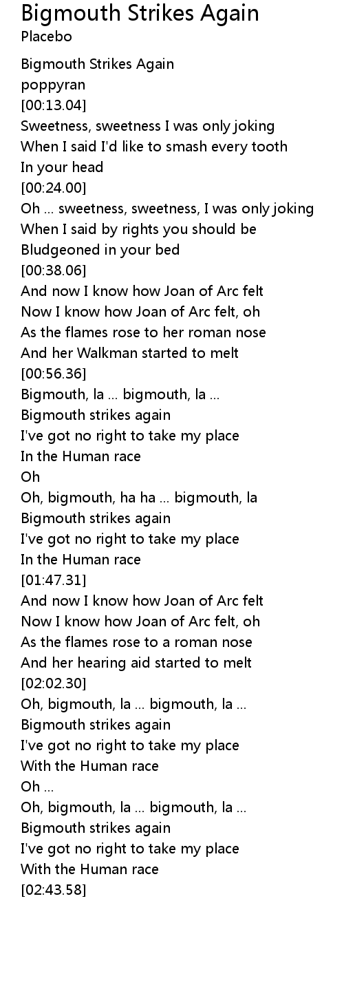 | [01:34.46] | Oh, bigmouth, ha ha ... bigmouth, la |
