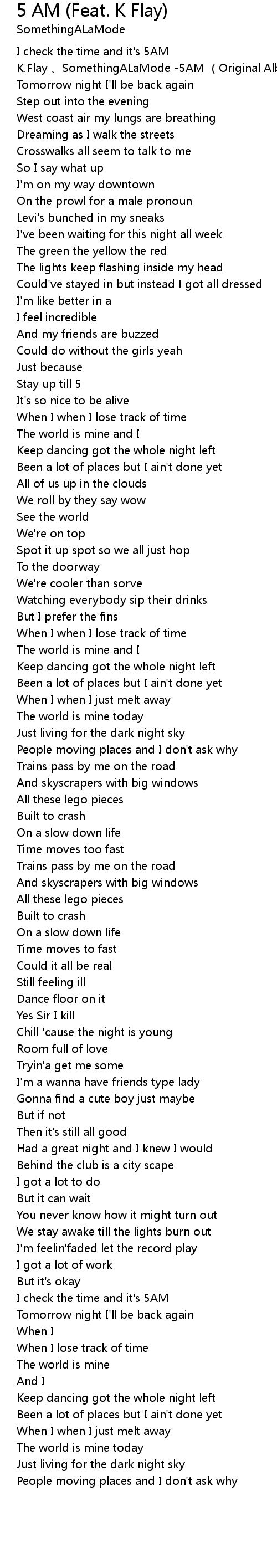 | [00:00.310] | K. Flay SomethingALaMode 5AM Original Album Version |