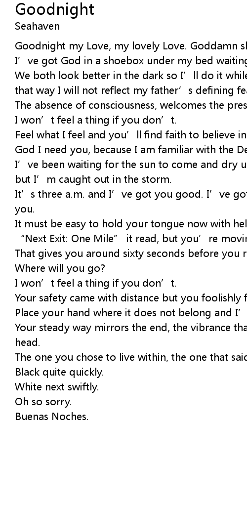 | Goodnight my Love, my lovely Love. Goddamn shame to be a traitor. | |