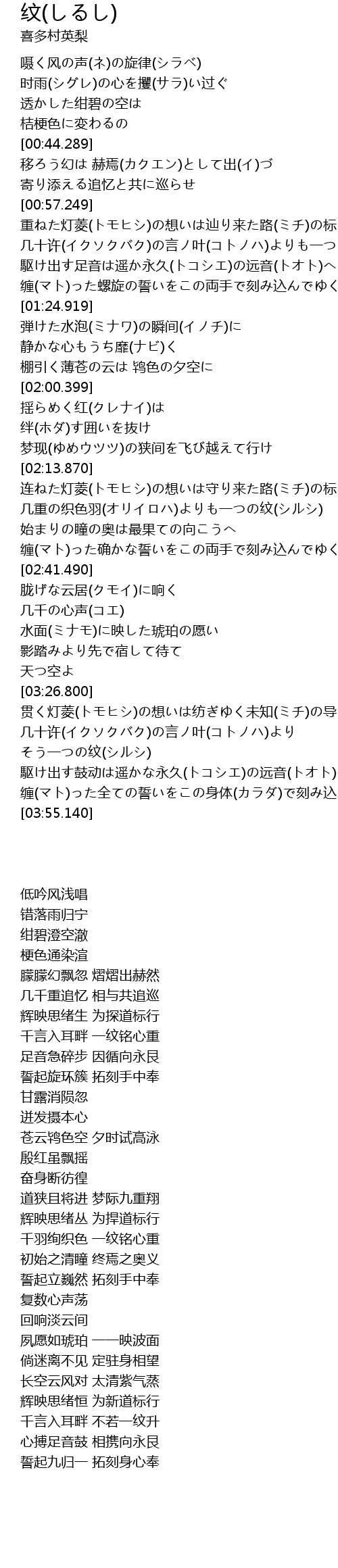 | [03:33.860] | 几十许(イクソクバク)の言ノ叶(コトノハ)より そう一つの纹(シルシ) |