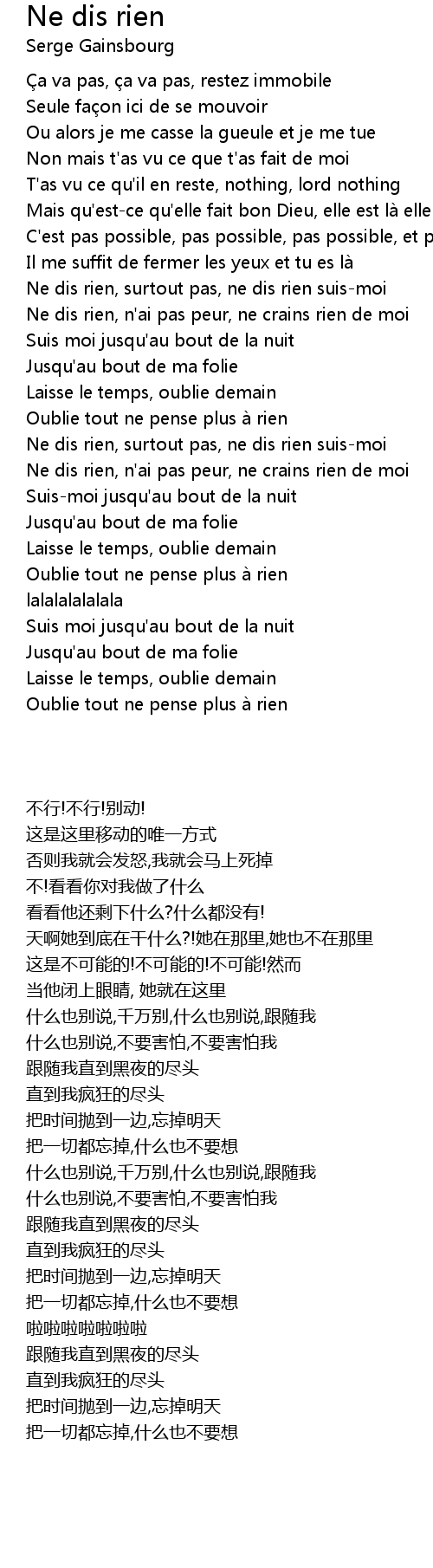| [00:57.20] | Ne dis rien, surtout pas, ne dis rien suismoi |