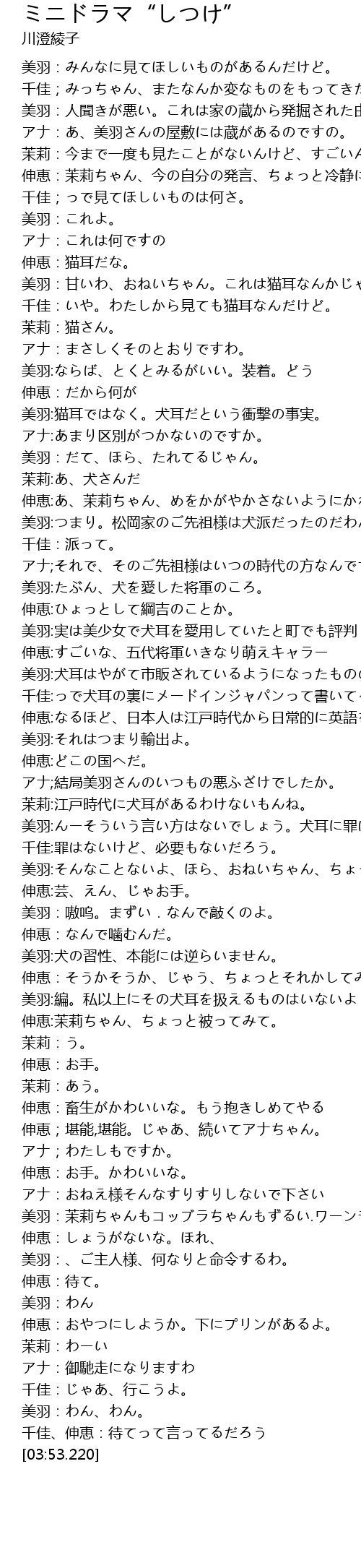 | [02:13.720] | 美羽:んーそういう言い方はないでしょう。犬耳に罪はないんだから。 |