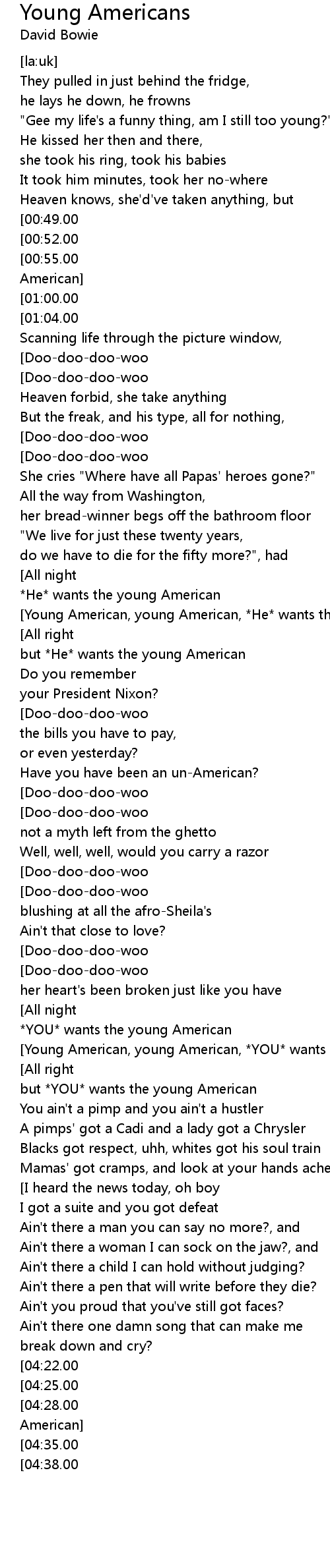 | [01:35.00][00:55.00][Young American, young American, *she* wants the young American] |