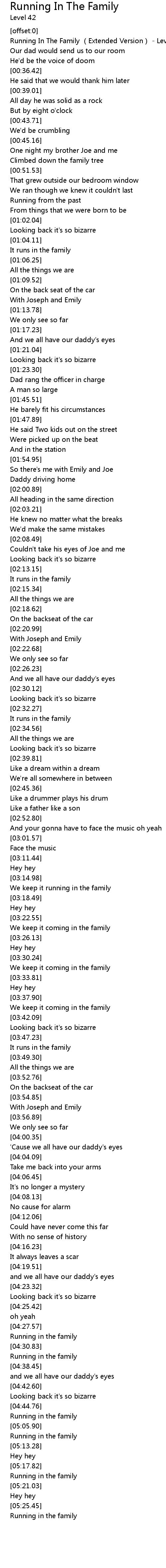 | [00:01.65] | Running In The Family Extended Version Level 42 |