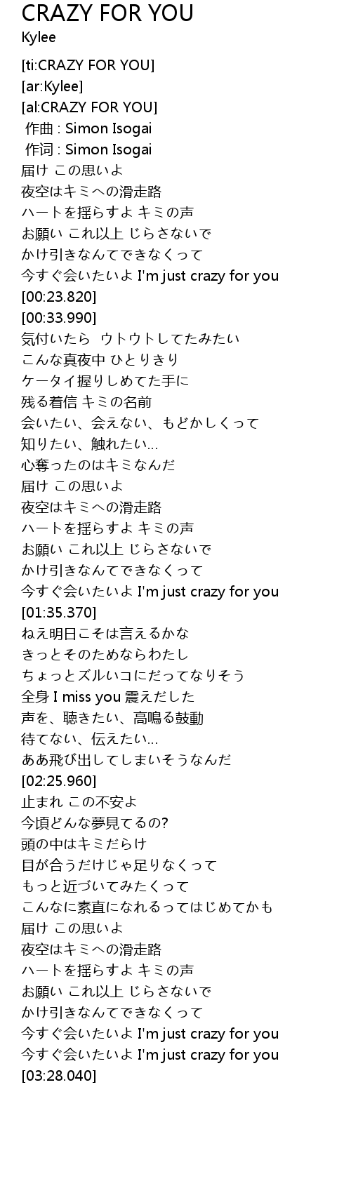 | [00:18.250] | 今すぐ会いたいよ I'm just crazy for you |