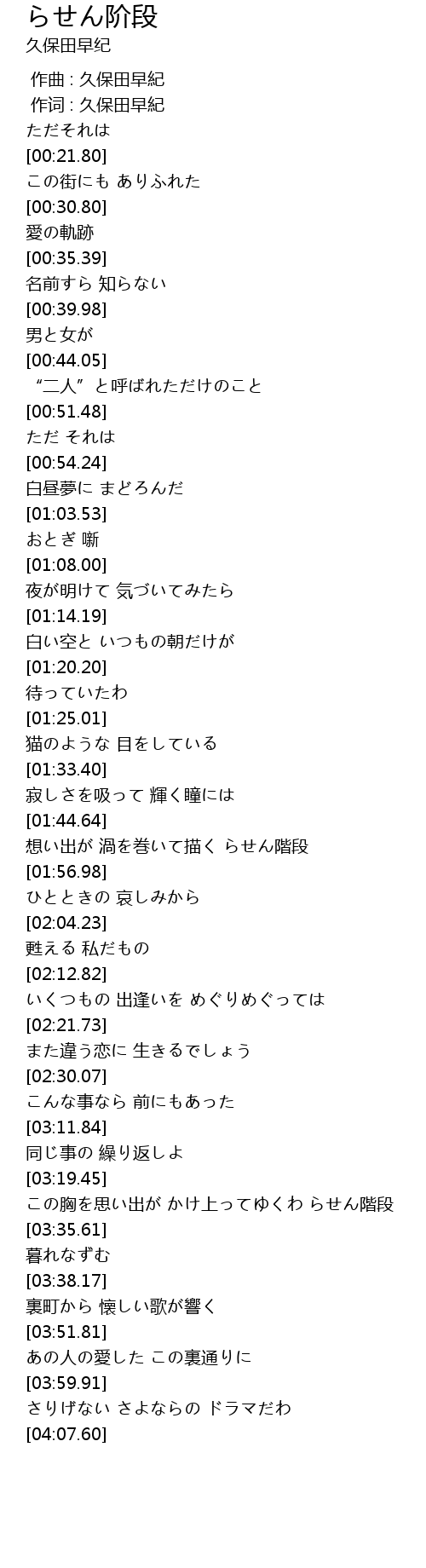 | [03:19.54] | この胸を思い出が かけ上ってゆくわ らせん階段 |