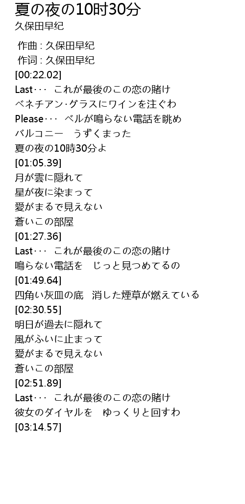 | [00:22.24] | Last・・・ これが最後のこの恋の賭け |