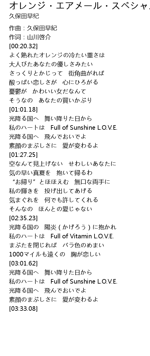 | [03:13.38] | 私のハートは Full of Sunshine L.O.V.E. |