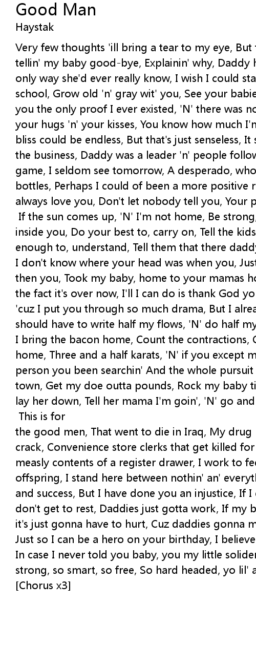 | Very few thoughts ' ill bring a tear to my eye, But the thoughta dyin' without tellin' my baby goodbye, Explainin' why, Daddy had to go, Believin' that' s the only way she' d ever really know, I wish I could stay with you, See you graduate school, Grow old ' n' gray wit' you, See your babies ' n' their babies too, Baby you the only proof I ever existed, ' N' there was nothin' more addictive, Than your hugs ' n' your kisses, You know how much I' m gonna miss this, I wish this bliss could be endless, But that' s just senseless, It seems as though this is the business, Daddy was a leader ' n' people followed, I stay so caught up in the game, I seldom see tomorrow, A desperado, who changed diapers ' n' warmed bottles, Perhaps I could of been a more positive role model, But DooWop I' ll always love you, Don' t let nobody tell you, Your pops wasn' t no good dude, Naw Boo Chorus: If the sun comes up, ' N' I' m not home, Be strong, There' s a life inside you, Do your best to, carry on, Tell the kids about me, When there old enough to, understand, Tell them that there daddy was, a good man, A good man... I don' t know where your head was when you, Just said Forget us, then you, Took my baby, home to your mamas house, Can' t even cry no mo', ' sect the fact it' s over now, I' ll I can do is thank God you a good mama, Apologize ' cuz I put you through so much drama, But I already give you half my doe, You should have to write half my flows, ' N' do half my shows, I keep the lights on, I bring the bacon home, Count the contractions, Cut the cord, Bring the baby home, Three and a half karats, ' N' if you except my proposal, I' ll be that person you been searchin' And the whole pursuit is over, I got a show outta town, Get my doe outta pounds, Rock my baby till she fall asleep, Take her and lay her down, Tell her mama I' m goin', ' N' go and sing songs, The sun come up ' n' I' m not home, Somethin' musta went wrong, So be strong, Chorus This is for the good men, That went to die in Iraq, My drug lord veterans, That died over crack, Convenience store clerks that get killed for nothin' more, Than the measly contents of a register drawer, I work to feed my seed, Protect my offspring, I stand here between nothin' an' everything, On the verge of failure and success, But I have done you an injustice, If I don' t do my best, Daddies don' t get to rest, Daddies just gotta work, If my back begins to ache, I guess it' s just gonna have to hurt, Cuz daddies gonna make it through the work day, Just so I can be a hero on your birthday, I believe the worst days almost over, In case I never told you baby, you my little solider, Damn girl so cute, so strong, so smart, so free, So hard headed, yo lil' ass' s just like me, Uhn Chorus x3 |