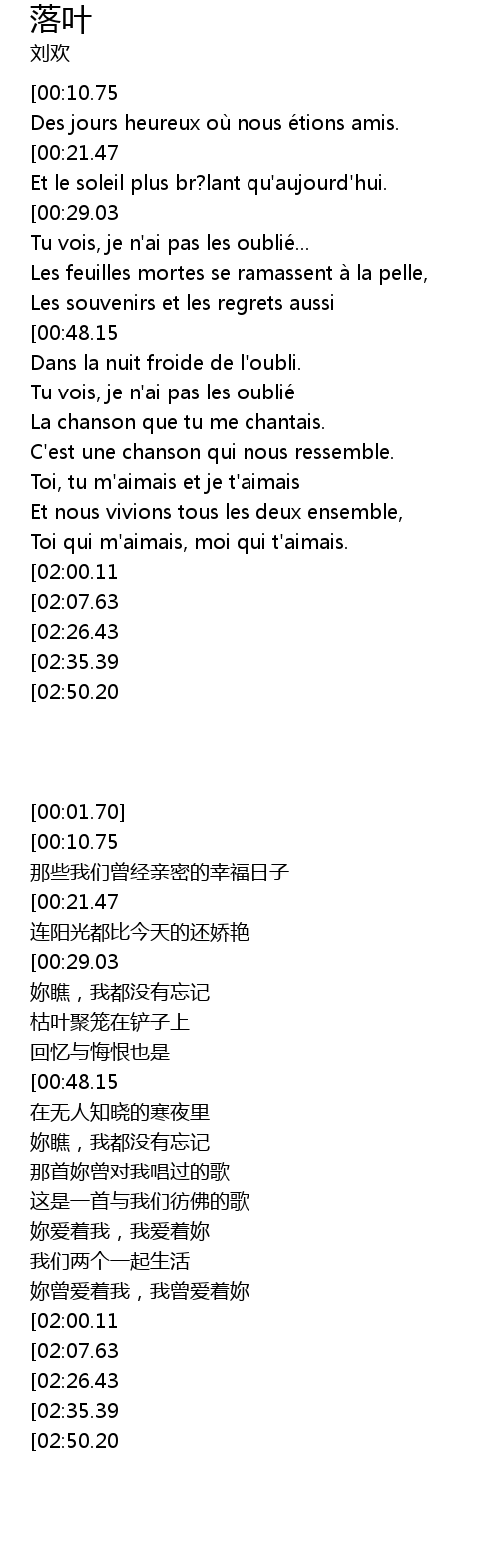 | [00:26.14][00:29.03] | Les feuilles mortes se ramassent a la pelle. |