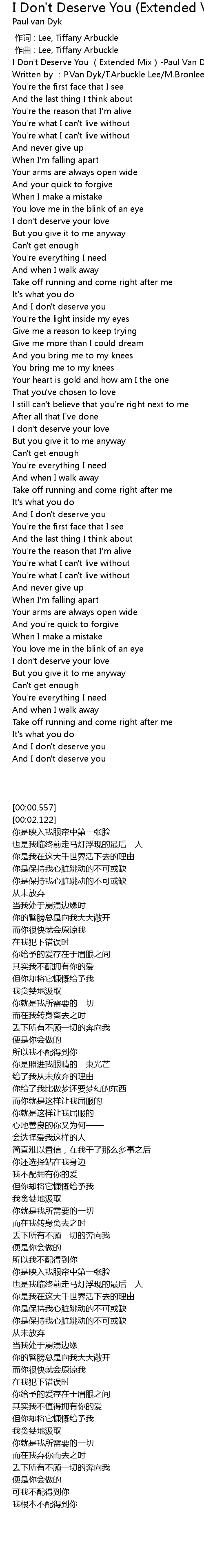 | [00:00.557] | I Don' t Deserve You Extended Mix Paul Van Dyk Plumb |