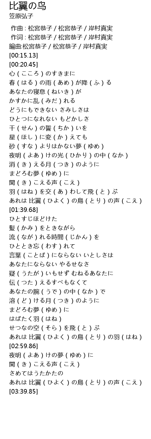 | [02:50.79] | あれは 比翼(ひよく)の鳥(とり)の羽(はね) |