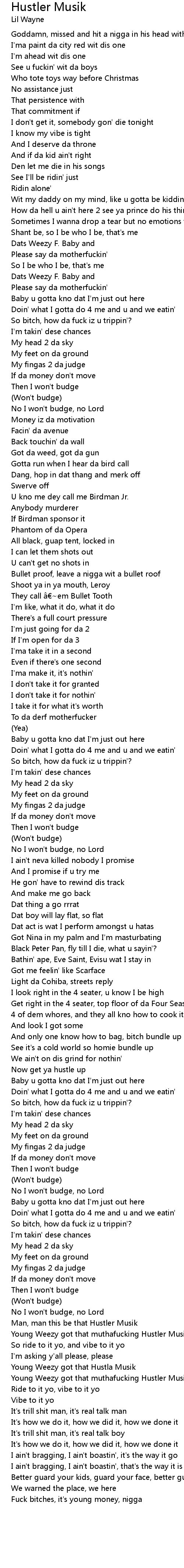 | Young Weezy got that muthafucking Hustler Musik, yo | |