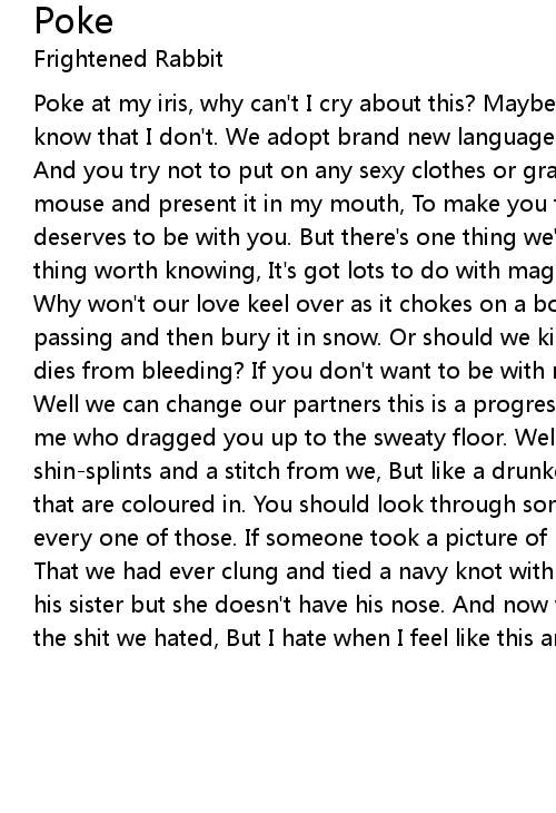 Poke at my iris, why can't I cry about this? Maybe there is something that you know that I don't. We adopt brand new language, communicate through pursed lips, And you try not to put on any sexy clothes or graces. I might never catch a mouse and present it in my mouth, To make you feel you're with someone who deserves to be with you. But there's one thing we've got going and it's the only thing worth knowing, It's got lots to do with magnets and the pull of the moon. Why won't our love keel over as it chokes on a bone? And we can mourn its passing and then bury it in snow. Or should we kick its cunt in and watch as it dies from bleeding? If you don't want to be with me just say and I will go. Oooh Well we can change our partners this is a progressive dance but Remember it was me who dragged you up to the sweaty floor. Well this has been a reel I've got shin-splints and a stitch from we, But like a drunken night it's the best bits that are coloured in. You should look through some old photos, I adored you in every one of those. If someone took a picture of us now they'd need to be told, That we had ever clung and tied a navy knot with arms at night. I'd say she was his sister but she doesn't have his nose. And now we're unrelated and rid of all the shit we hated, But I hate when I feel like this and I never hated you. Oooh