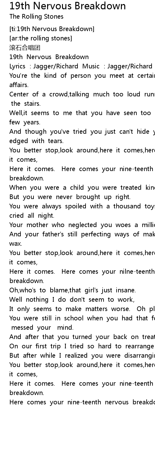 | [02:19.908] | Here it comes. Here comes your nineteenth nervous breakdown. |