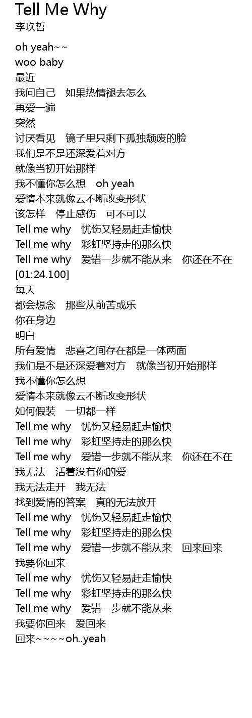 | [02:33.390] | Tell me why ài cuò yī bù jiù bù néng cóng lái nǐ hái zài bù zài |