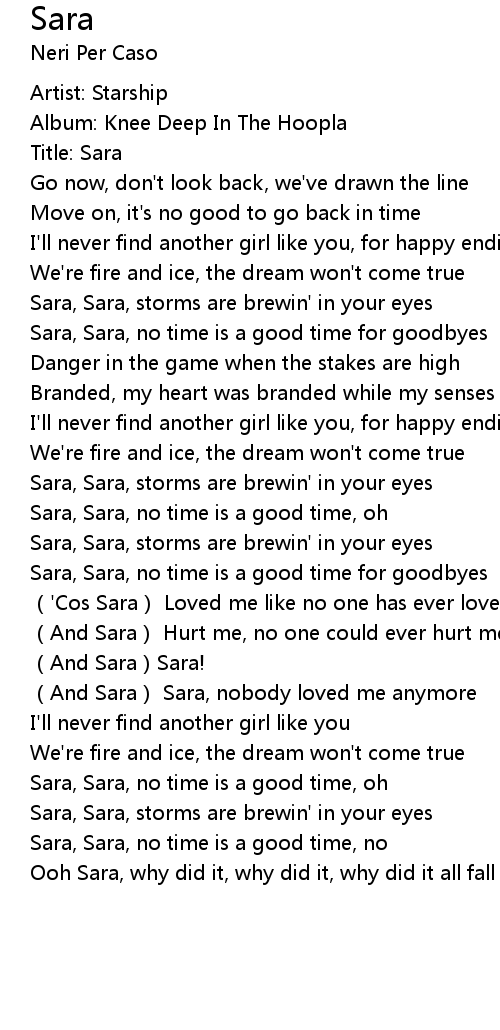 | [01:46.69] | Sara, Sara, storms are brewin' in your eyes |