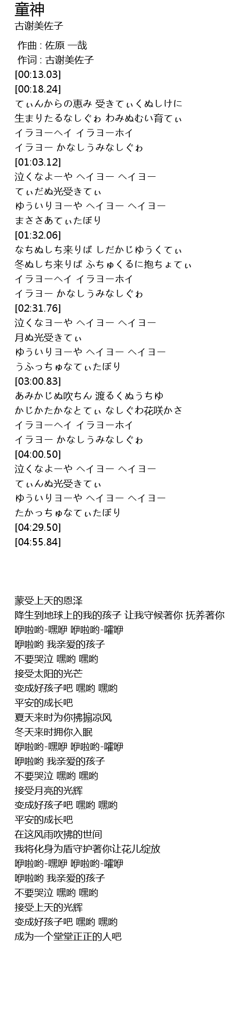 | [00:19.14] | てぃんからの恵み 受きてぃくぬしけに |