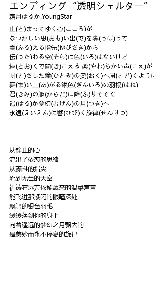 | [00:52.06] | 舞(ま)い上(あ)がる銀色(ぎんいろ)の羽根(はね) |
