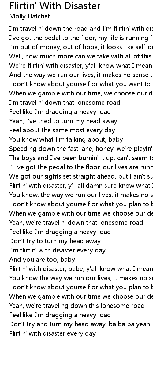 | I' m travelin' down the road and I' m flirtin' with disaster | |