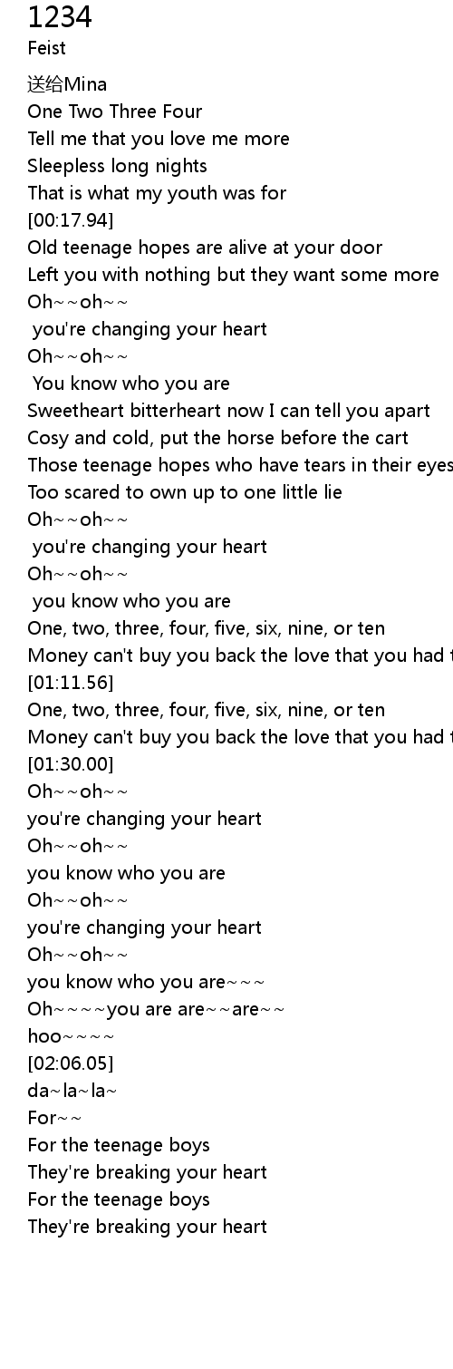 | [01:19.48] | One, two, three, four, five, six, nine, or ten |