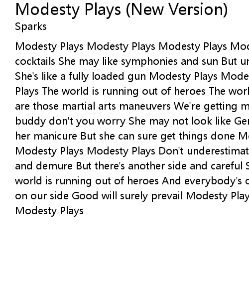 Modesty Plays Modesty Plays Modesty Plays Modesty Plays She may like caviar and cocktails She may like symphonies and sun But underneath the gown and high heels She's like a fully loaded gun Modesty Plays Modesty Plays Modesty Plays Modesty Plays The world is running out of heroes The world is running out of time Where are those martial arts maneuvers We're getting massacred by crime Well listen buddy don't you worry She may not look like Genghis Khan And she may talk about her manicure But she can sure get things done Modesty Plays Modesty Plays Modesty Plays Modesty Plays Don't underestimate the lady She may seem cultured and demure But there's another side and careful She'll hit you like a 2 x 4 The world is running out of heroes And everybody's out on bail As long as Modesty is on our side Good will surely prevail Modesty Plays Modesty Plays Modesty Plays Modesty Plays |