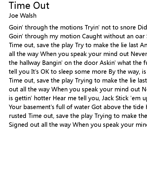 Goin' through the motions Tryin' not to snore Didn't know the gun was loaded Goin' through my motion Caught without an oar Someone said they all were phony Time out, save the play Try to make the lie last Any old way we can Signed out all the way When you speak your mind out Never say what you plan I met her in the hallway Bangin' on the door Askin' what the funny smell was Wake you up and tell you It's OK to sleep some more By the way, is there any you can sell us? Time out, save the play Trying to make the lie last Any old way we can Signed out all the way When you speak your mind out Never say what you plan So the case is gettin' hotter Hear me tell you, Jack Stick 'em up, you've just been busted Your basement's full of water Got above the tide Hope to God the pump ain't rusted Time out, save the play Trying to make the lie last Any old way we can Signed out all the way When you speak your mind out Never say what you plan