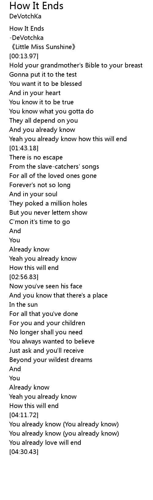 | [00:43.98] | Hold your grandmother' s Bible to your breast |