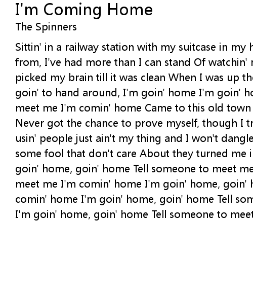 Sittin' in a railway station with my suitcase in my hand Goin' back where I came from, I've had more than I can stand Of watchin' men destroy my dreams, they picked my brain till it was clean When I was up they knocked me down I ain't goin' to hand around, I'm goin' home I'm goin' home, goin' home Tell someone to meet me I'm comin' home Came to this old town seeking fortune and some fame Never got the chance to prove myself, though I tried to play their game But usin' people just ain't my thing and I won't dangle from any string To please some fool that don't care About they turned me inside out, I'm goin' home I'm goin' home, goin' home Tell someone to meet me I'm comin' home Tell someone to meet me I'm comin' home I'm goin' home, goin' home Tell someone to meet me I'm comin' home I'm goin' home, goin' home Tell someone to meet me I'm comin' home I'm goin' home, goin' home Tell someone to meet me I'm comin' home |
