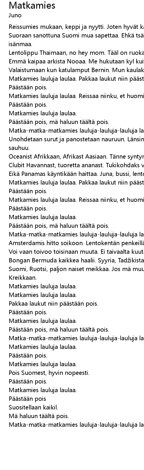 | Matkamies lauluja laulaa. Pakkaa laukut niin p st n pois. | |