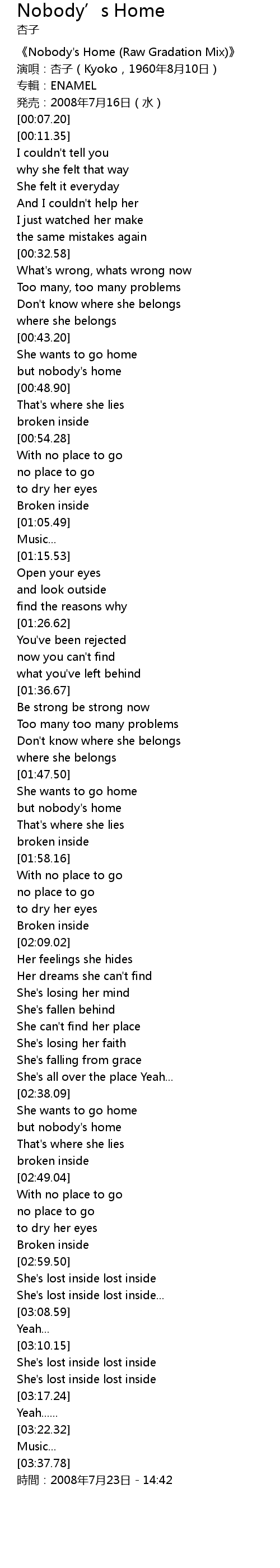 | [00:00.74] | 《Nobody's Home (Raw Gradation Mix)》 |
