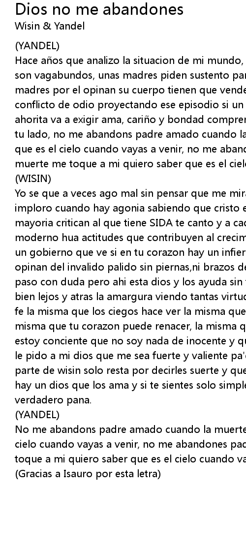 | Yo se que a veces ago mal sin pensar que me miran, el mesias y que solamente lo imploro cuando hay agonia sabiendo que cristo es mi guia y es que yo y la mayoria critican al que tiene SIDA te canto y a cada rato al emfermo, eso es lo moderno hua actitudes que contribuyen al crecimiento de infierno pero arriba hay un gobierno que ve si en tu corazon hay un infierno y hablando de lo interno que opinan del invalido palido sin piernas, ni brazos de recursos escasos que dan un paso con duda pero ahi esta dios y los ayuda sin tener fortuna y dejando atras bien lejos y atras la amargura viendo tantas virtudes y me fijo en una, y en la fe la misma que los ciegos hace ver la misma que tu puedes tener al nacer, la misma que tu corazon puede renacer, la misma que te puede ense ar a querer y yo estoy conciente que no soy nada de inocente y que de lo malo eh sido un cliente le pido a mi dios que me sea fuerte y valiente pa' enfrentarme al presente d parte de wisin solo resta por decirles suerte y que leven en su mente que arriba hay un dios que los ama y si te sientes solo simplemente llama que cristo es un verdadero pana. | |