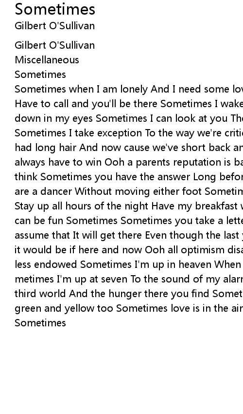 Sometimes when I am lonely And I need some love and care Sometimes I feel I only Have to call and you'll be there Sometimes I wake up in the morning With my hair down in my eyes Sometimes I can look at you Then I don't and then I do Sometimes Sometimes I take exception To the way we're criticized Once it was because we had long hair And now cause we've short back and sides They never stop they always have to win Ooh a parents reputation is based Only on what the neighbours think Sometimes you have the answer Long before the questions put Sometimes you are a dancer Without moving either foot Sometimes I get undressed for dinner Stay up all hours of the night Have my breakfast with my lunch Well you know it can be fun Sometimes Sometimes you take a letter And you post it in a box You assume that It will get there Even though the last you sent got lost How tragic it would be if here and now Ooh all optimism disappeared Replaced by something less endowed Sometimes I'm up in heaven When you hold me in your arms So