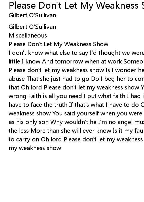I don't know what else to say I'd thought we were doing okay Shows you how little I know And tomorrow when at work Someone calls out does it hurt Oh lord Please don't let my weakness show Is I wonder her excuse Given there was no abuse That she just had to go Do I beg her to come back If I have to act like that Oh lord Please don't let my weakness show You said yourself when things go wrong Faith is all you need I put what faith I had in her And got deceived If I have to face the truth If that's what I have to do Oh lord Please don't let my weakness show You said yourself when you were lost God will rescue me But surely as his only son Why wouldn't he I'm no angel must confess But I loved her none the less More than she will ever know Is it my fault that she's gone If I have to carry on Oh lord Please don't let my weakness show Oh lord Please don't let my weakness show