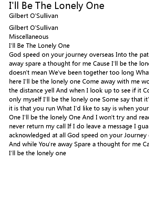 God speed on your journey overseas Into the path of the sun And while you're away spare a thought for me Cause I'll be the lonely one You say that my leaving doesn't mean We've been together too long What it does mean however is till Your here I'll be the lonely one Come away with me won't you I can hear A voice in the distance yell And when I look up to see if it Could be you I see that it's only myself I'll be the lonely one Some say that it's easy to forget The further it is that you run What I'd like to say is when your not here I'll be the lonely One I'll be the lonely One And I won't try and reach you there's no point you never return my call If I do leave a message I guarantee It won't be acknowledged at all God speed on your Journey overseas Into the path of the sun And while You're away Spare a thought for me Cause I'll be the lonely one Yes, I'll be the lonely one |