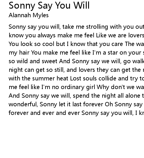Sonny say you will, take me strolling with you out on the boardwalk 'Cause you know you always make me feel Like we are lovers on parade with your sweet talk You look so cool but I know that you care The way you run your fingers through my hair You make me feel like I'm a star on your sleeve The way you hold me it's so wild and sweet And Sonny say we will, go walking down by the ocean 'Cause the night can get so still, and lovers they can get the notion The street is crazy with the summer heat Lost souls collide and try to land on their feet You make me feel like I'm no ordinary girl Why don't we walk out of this every day world And Sonny say we will, spend the night all alone together This is some kinda wonderful, Sonny let it last forever Oh Sonny say you will, Sonny let it last forever and ever and ever Sonny say you will, I know you will I know you will |