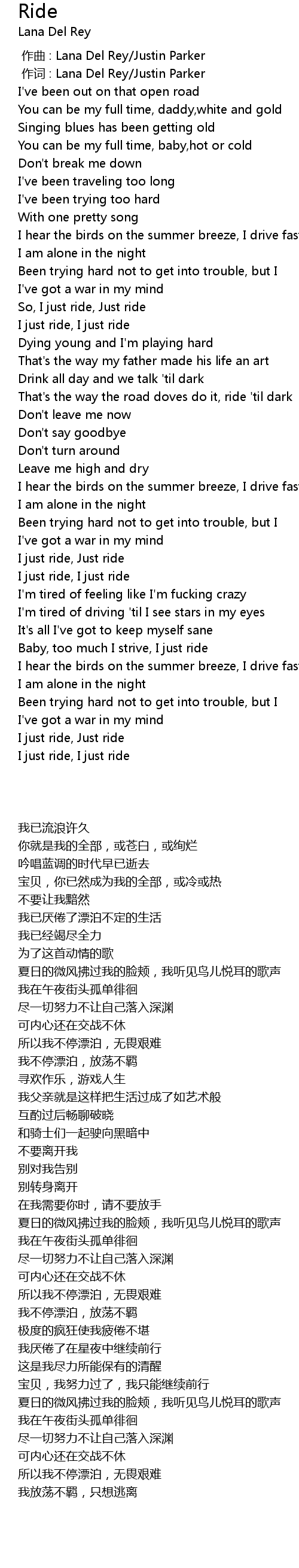 | [00:01.00] | 作词 : Lana Del Rey/Justin Parker |