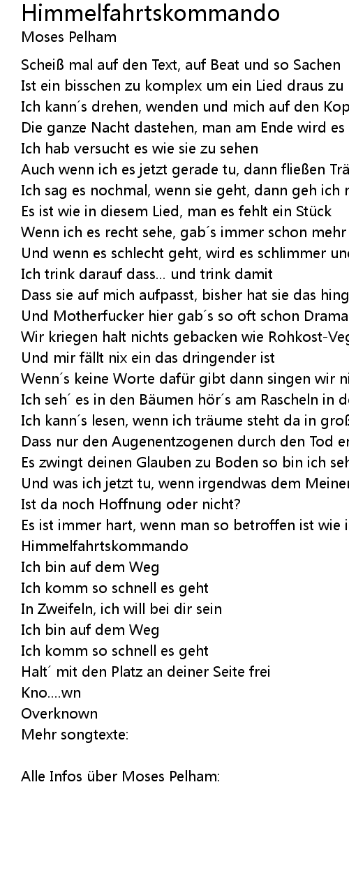 | Es ist wie in diesem Lied, man es fehlt ein Stück | |