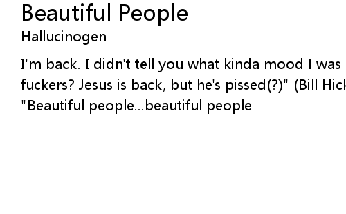 | I'm back. I didn't tell you what kinda mood I was coming back into. Did I, fuckers? Jesus is back, but he's pissed(?)" (Bill Hicks) | |