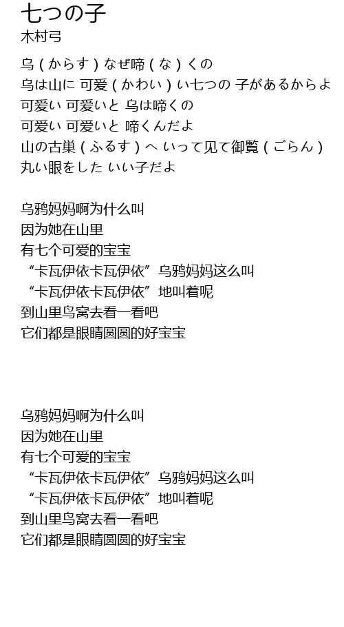 | 乌は山に 可爱(かわい)い七つの 子があるからよ | |