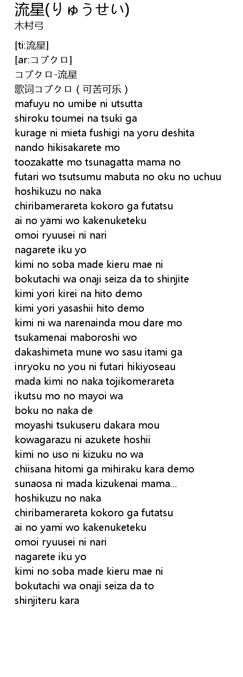 | [00:56.130] | futari wo tsutsumu mabuta no oku no uchuu |