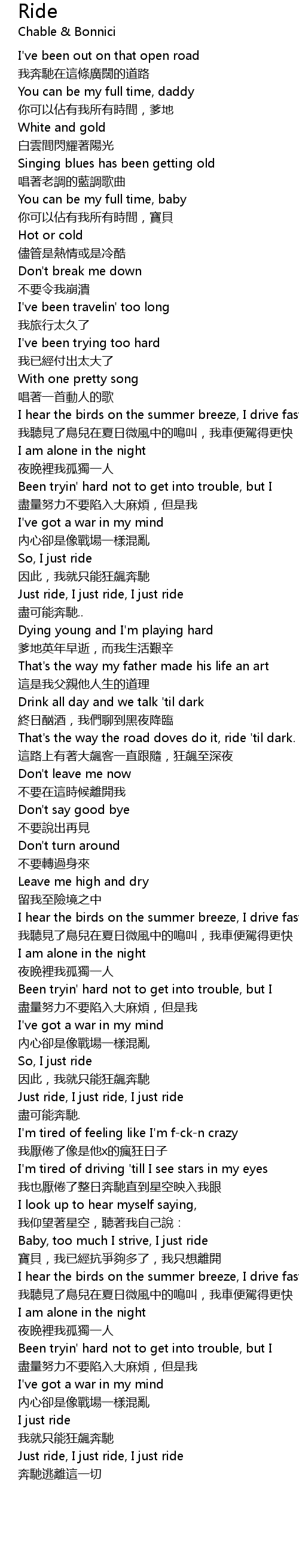 | wǒ tīng jiàn le niǎo ér zài xià rì wēi fēng zhōng de míng jiào, wǒ chē biàn jià dé gèng kuài | |