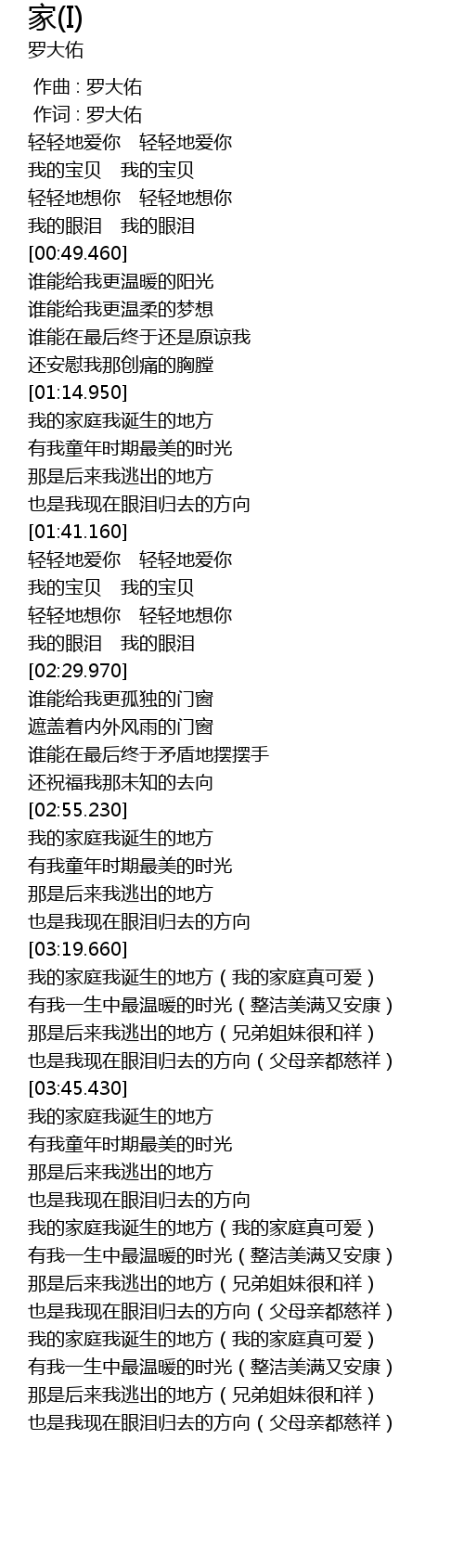| [04:11.440] | wo de jia ting wo dan sheng de di fang wo de jia ting zhen ke ai |