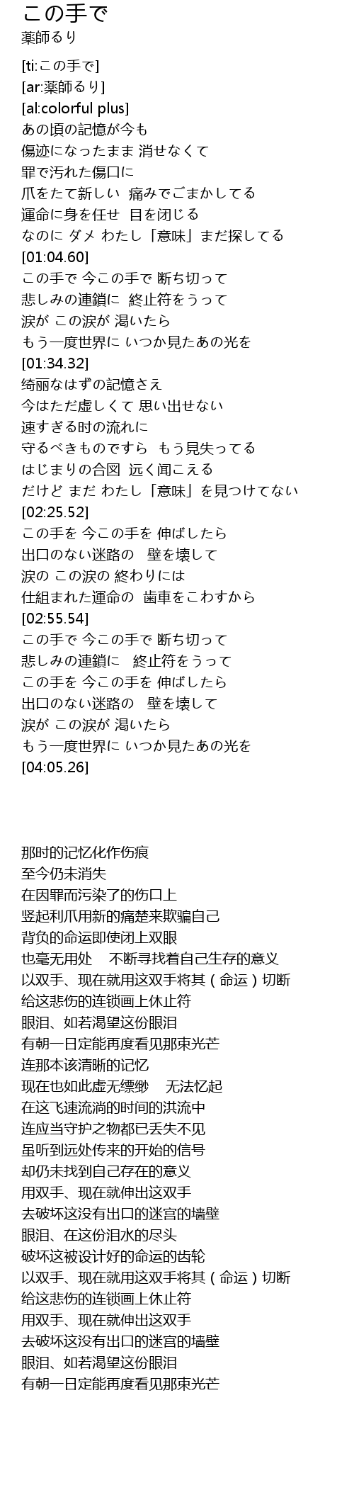 | [01:05.10] | この手で 今この手で 断ち切って |