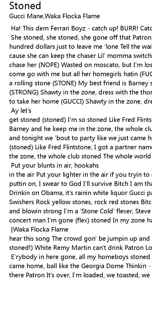 [Intro] Ha! This dem Ferrari Boyz - catch up! BURR! Catch up! Catch up! [Gucci Mane] She stoned, she stoned, she gone off that Patron I gave that bitch a hundred dollars just to leave me 'lone Tell the waitress bring mo' bottles up cause she can keep the chaser Lil' momma switchin by my section she want me to chase her (NOPE) Wasted on moscato, but I'm losin my patience I'm tellin her come go with me but all her homegirls hatin (FUCK 'EM) Like Fred Flintstone, I'm a rolling stone (STONE) My best friend is Barney so you know I'm rollin strong (STRONG) Shawty in the zone, dress with the thong Every nigga in the club tryin to take her home (GUCCI) Shawty in the zone, dress with the thong And every player in the club tryin to take her home (Gucci) [Chorus: Gucci Mane] Ay let's get stoned (stoned) I'm so stoned Like Fred Flintstone, I got a partner named Barney and he keep me in the zone, the whole club stoned The whole world stoned, and tonight we 'bout to party like we just came home; ay let's get stoned (stoned) Like Fred Flintstone, I got a partner named Barney and he keep me in the zone, the whole club stoned The whole world stoned, tonight we 'bout to party like we just came home [Waka Flocka Flame] Put your blunts in air, hookahs in the air Put your lighter in the air if you tryin to get stoned Tonight I'm puttin on, I swear to God I'll survive Bitch I am that high! Yes I am stoned Drinkin on Obama, it's rainin white liquor Gucci pass the dutches, I don't do no Swishers Rock yellow stones, rock red stones Bitch my money long, poppin pills and blowin strong I'm a 'Stone Cold' flexer, Steve Austin (stunner) Every concert man I'm gone (flex) stoned In my zone hater leave me alone, be gone Bird chains in the air - screamin as I yell [Chorus] [Waka Flocka Flame] When you hear this song The crowd gon' be jumpin up and down Screamin I'm stoned! (I'm stoned!) White Remy Martin can't drink Patron Lost my keys I can't even make it home [Gucci Mane] E'rybody in here gone, all my homeboys stoned My dogs just came home, ball like the Georgia Dome Thinkin - it's back on, drinkin - that there Patron It's over, I'm loaded, we toasted, we grown [Chorus] |