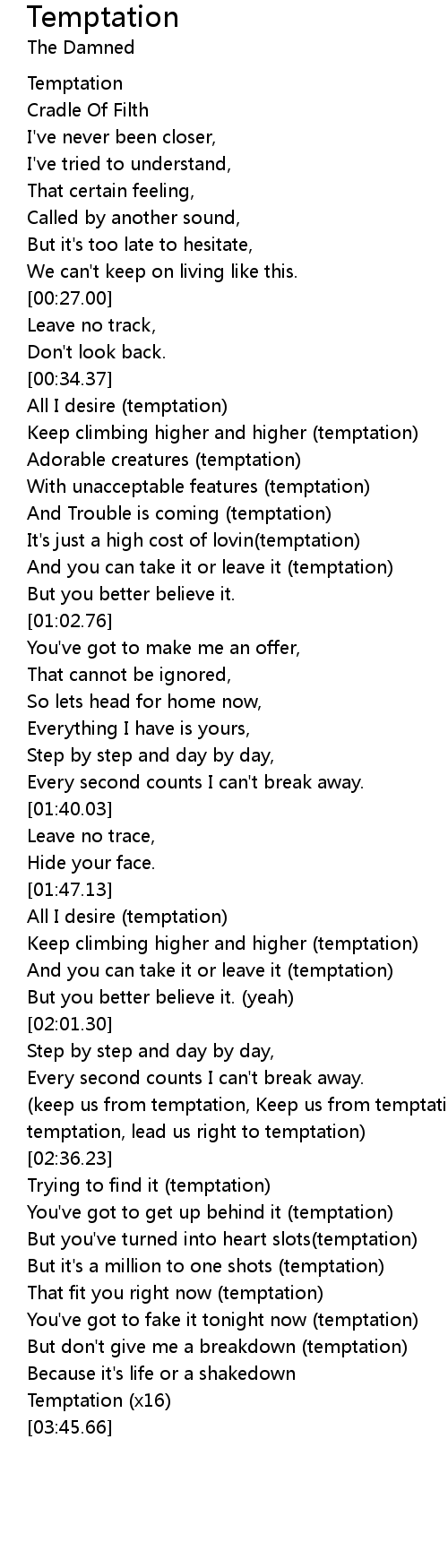 [02:23.16] (keep us from temptation, Keep us from temptation, Keep us from temptation, lead us right to temptation)