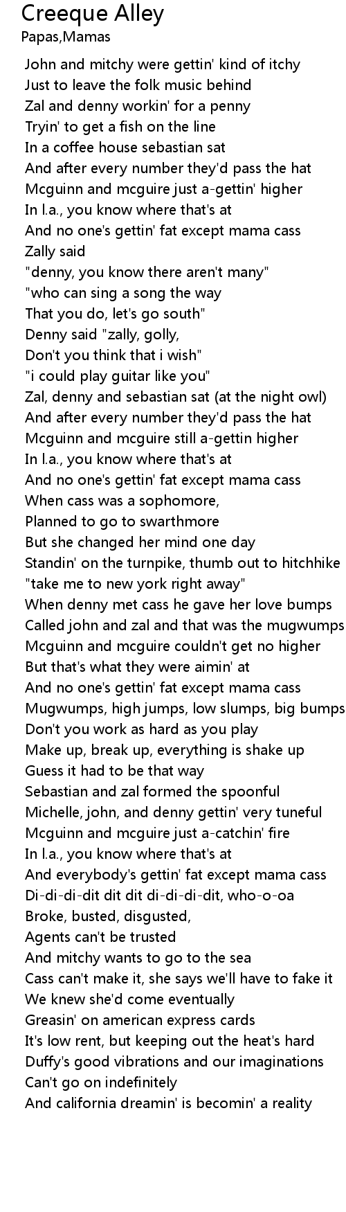 | [01:46.660] | And no one's gettin' fat except mama cass |