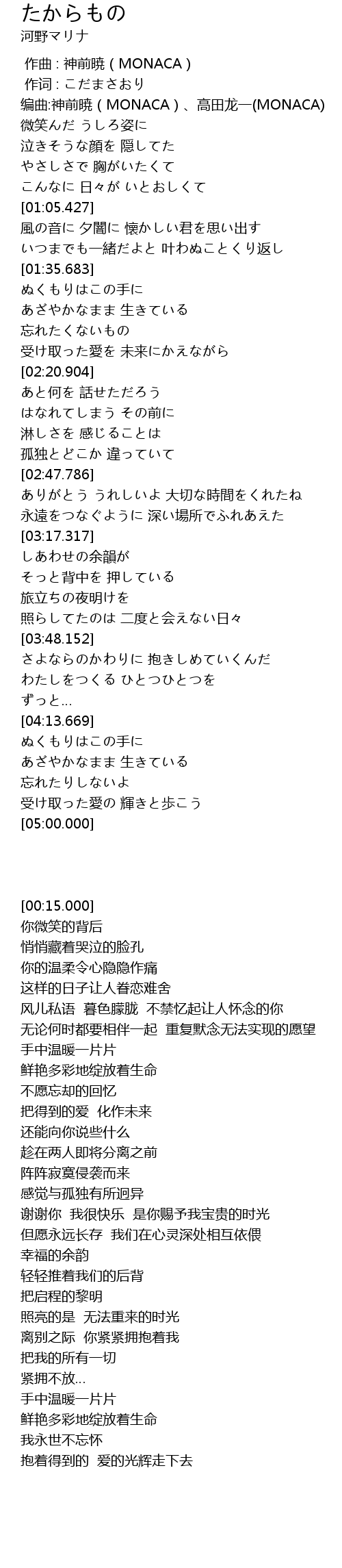| [00:15.000] | 编曲:神前暁(MONACA)、高田龙一(MONACA) |